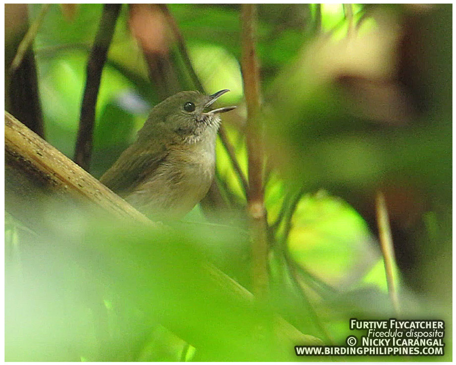 This is a Furtive Flycatcher, one of the 11 endemic flycatchers of the Philippines. This uncommon endemic is confined to the western and northeastern parts of Luzon in the Zambales Mountains and the Northern and Southern Sierra Madres and is found usually in dense second growth particularly climbing bamboo. As the name implies, it is highly secretive, and the drab brown coloration helps it blend in its dark, dense undergrowth habitat. Like most secretive forest birds, this one is best located by its faint high pitched 2-3-note call, (similar to its Mindanao relative – the Little Slaty Flycatcher) given while perched motionlessly in the dense bamboo tangles.