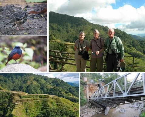 Luzon birding: From top-left clockwise. Ashy Ground Thrush in La Mesa Ecopark. Photo by Nicky Icarangal; Our group with the Banaue Rice Terraces at the background. Photo by Tour participant David Clugston; A collapsed bridge on the way to Banaue. Photo by David Clugston; The Banaue Rice Terraces. Photo by Adri Constantino; Luzon Water-Redstart Photo by Nicky Icarangal