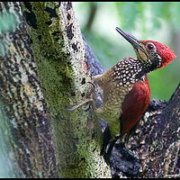 These woodpeckers prefer forests and forests edge more commonly in lowland forests. Their strong bills are used for drilling holes into tree trunks to extract worms and insects. Luzon Flamebacks are found all over the Philippines with four races having distinctive characteristics. This pair is from the haematribon race and are considered as endemic subspecies found only in the islands of Luzon, Catanduanes and Marinduque.